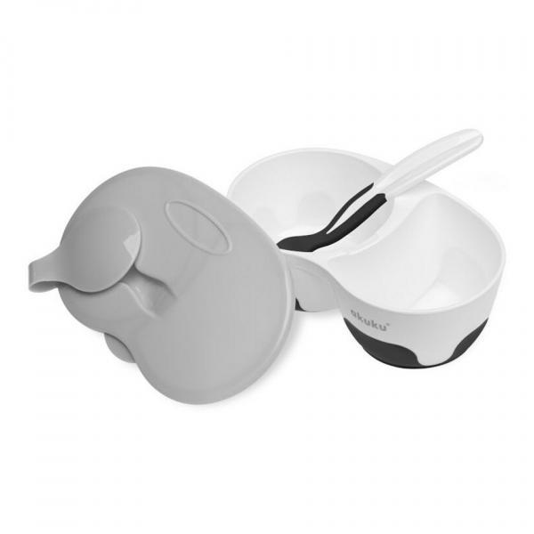 Двокамерна дитяча тарілка, що підходить не тільки для подорожей, призначена для дітей від 6 місяців. Має нековзне дно та оснащена практичною ложкою. Камери мають об'єм 200 мл та 150 мл. Виготовлені із високоякісного пластику. Не містить BPA