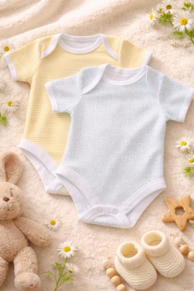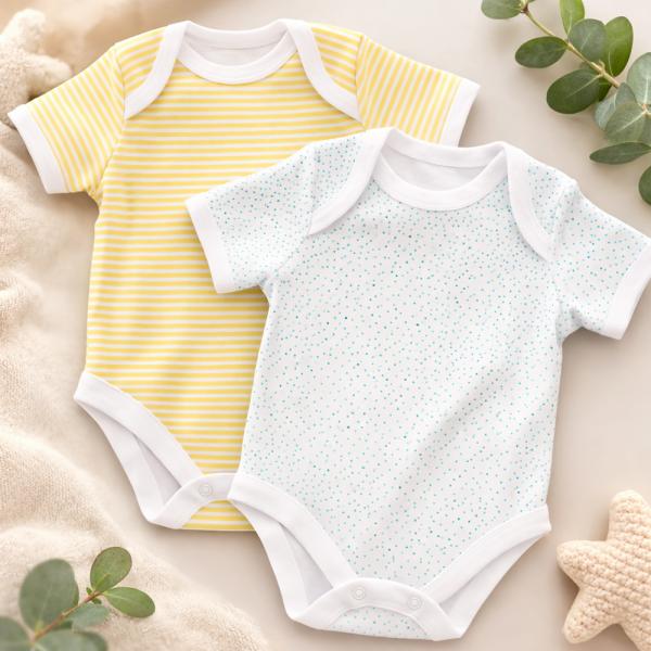 Ніжний та комфортний набір боді для малюків створений для щоденного використання. У комплект входять два стильні боді: один із м’якими жовтими смужками, інший — з крапковим принтом. Лаконічний дизайн і світлі пастельні кольори роблять їх універсальним вибором для гардеробу немовляти.