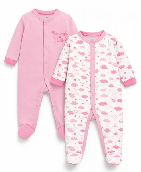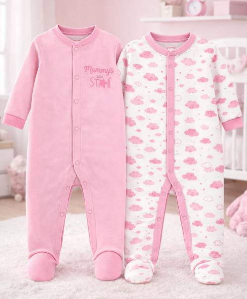 Милий та практичний набір дитячих сліпів, створений для максимального комфорту малюка. У комплект входять два чоловічки: один однотонний ніжно-рожевий із принтом “Mummy’s little STAR”, інший — білий із чарівним рожевим візерунком у вигляді хмаринок та зірочок.