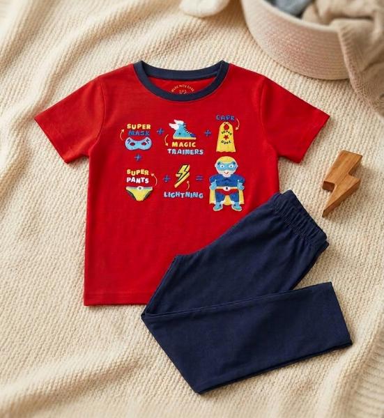 Верх: Яскрава червона футболка з короткими рукавами та круглим вирізом горловини. Центральне місце займає оригінальний принт у вигляді інструкції "Створи свого супергероя". На ньому зображені супергеройська маска, чарівні кросівки, блискавка та сам малюк-супергерой у плащі. Принт доповнено грайливими написами англійською мовою: "SUPER HEROES", "MAGIC TRAINERS", "SUPER PANTS" та "LIGHTNING".