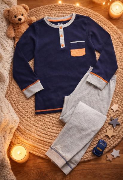 Стильна та комфортна піжама для хлопчика — ідеальний вибір для домашнього відпочинку та сну. Комплект складається з темно-синього реглана з довгим рукавом і зручних сірих штанів. Дизайн поєднує класичні кольори з яскравими помаранчевими акцентами, що робить піжаму сучасною та привабливою.